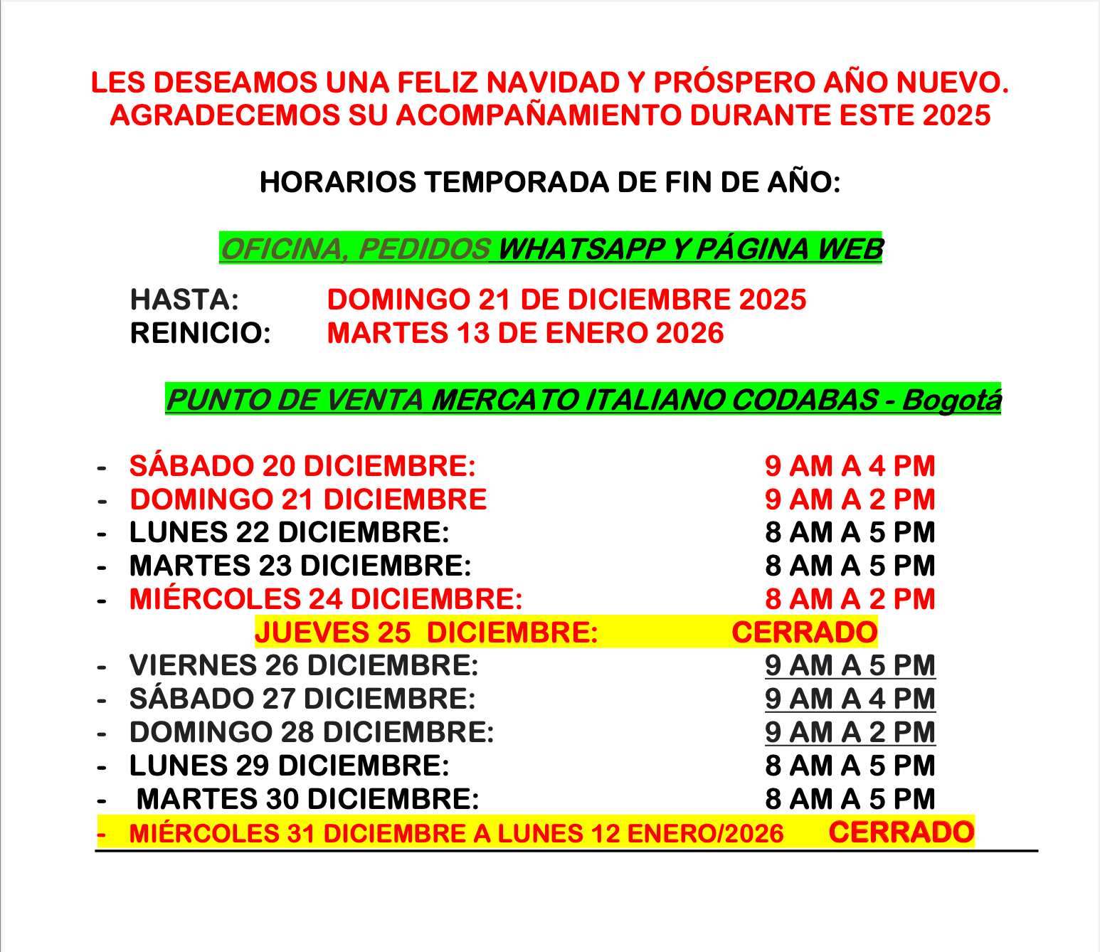 Página web deshabilitada hasta el 13 de Enero. Si necesita algún producto, lo puede adquirir hasta el 30 de Diciembre en nuestro punto de venta en Codabas en los siguientes horarios: